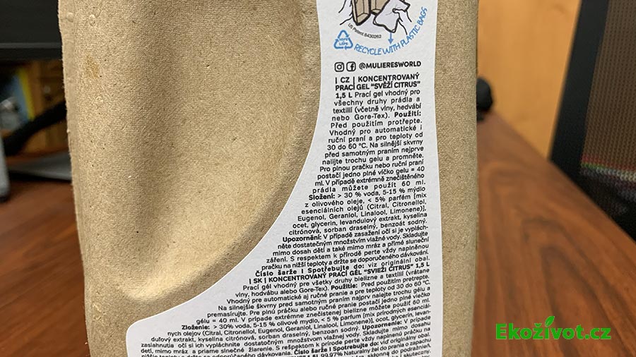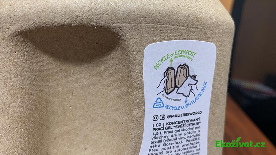 Obal pracího gelu je samozřejmě v duchu zásad „zelené“ značky Muliers vyroben z recyklovaných kartonů. Vnější část je navíc biodegradabilní neboli rozložitelná. Karton proto výrobce doporučuje vyhodit na domácí kompost nebo do hnědé popelnice na bioodpad. Plastový sáček vhoďte do žluté popelnice na plast, kam patří i plastový kohoutek u balení s objemem 15 l.