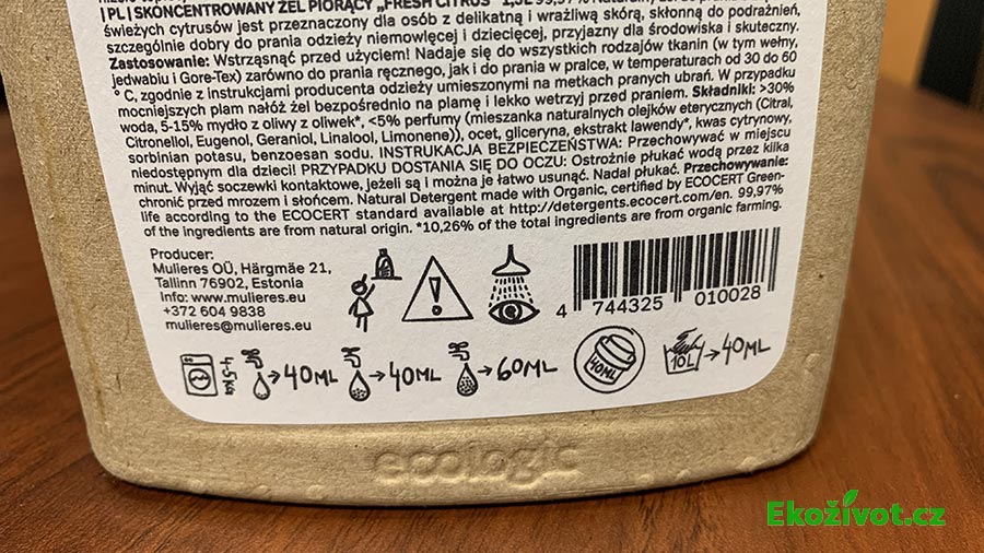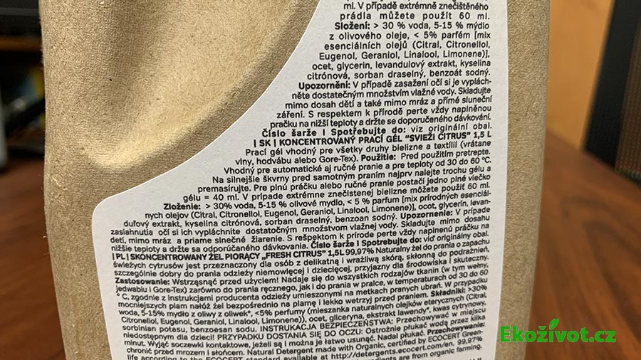 Díky tomu je gel dostatečně šetrný i pro citlivou pokožku. Jeho přednosti potvrzuje i certifikace Natural Detergent made with Organic od EcoCertu, což je, jak deklaruje přímo samotný výrobce potvrzení kvality, které ani u přírodních pracích přípravků není zdaleka běžné.